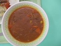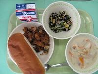 今日の献立は、ブルーベリーパン・ビーンズトマトスープ・かぼちゃのサモサ・海草サラダ・ぶどう・牛乳です。