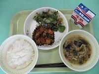 今日の献立は、ごはん・春雨スープ・高野豆腐のマーボソース・スタミナサラダ・牛乳です。
