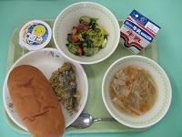 今日の献立は、コッペパン・ジュリエンヌスープ・さわらのフリッター・しょうゆフレンチサラダ・お月見ゼリー・牛乳です。