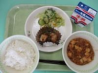 今日の献立は、ごはん・マーボ豆腐・揚げシュウマイのあんかけ・レンズ豆のサラダ・牛乳です。