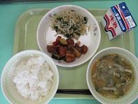 今日の献立は、コッペパン・和風スパゲティ・チキンのカレーフリカッセ・なすのサラダ・牛乳です。