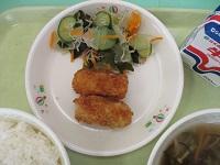 今日の献立は、コッペパン・チキンとセロリのレモンスープ・かぼちゃのコロッケ・プチトマト・ナタデココヨーグルト・牛乳です。