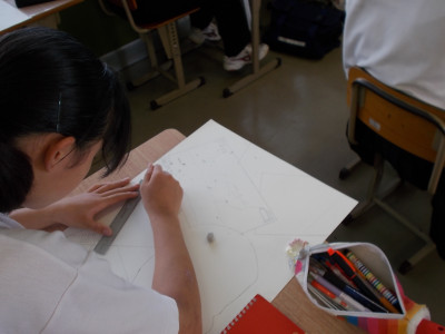 2年生は、美術科の授業で自画像の背景画を制作しています。美術室はエアコンが設置されていないため、教室で作業を行いました。アイデアスケッチができた生徒から、画用紙に鉛筆で下絵を描いています。